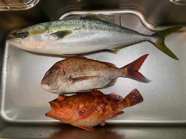 12月30日納竿釣行してきました。鳥羽市菅島の乗合船長栄丸午前7時出航の一日便、イワシの泳がせ釣りでした。8名の満席でクジ引きで右舷トモ、四隅に座れて幸先よし、北西風程々で曇天、釣りに支障なしでした。40分程で石鏡沖の水深68mのポイントに到着、周りにはジギング船が数艘集まっていました。オモリ60号、イワシを底から1mぐらい上を泳がせるイメージです。一投目は空振り、2投目で強いアタアリがあって途中の引き込みも強烈、やり取りを制してワラサが親父船長の差し出すタモに収まりました。何とかお土産を確保して一安心。時合なのか続けてアタリ、引き込みが先ほどより強く10秒ほど底付近で耐えましたがフッとテンションが抜けて逃げられました。ブリだったのかも、気を取り直して同サイズのワラサを追加して青物時合は終了、船団もばらけました。中盤からは鳥羽湾内に大移動、鳥羽国際ホテルが見える海域です。水深40〜50mで起伏のあるポイント、根掛かり注意です。なかなかアタリが来ずダメかなぁと思い始めた時に根掛かりと間違う重量感、根掛かりではなく生命反応ありで大物確信、底から離してしまえば途中の暴れは弱く良型ヒラメ(後計測60cm)をゲット。久しぶりの肉厚寒ビラメで感動ものでした。あと良型キジハタ(アコウ)を追加したものの後半は潮が流れなくなって午後2時の沖あがりまでアタリなく納竿となりました。釣果は65cmワラサ2匹、60cmヒラメ1匹、40cmキジハタ1匹でした(写真@)。坊主(釣果0)の人が2名いたことを考えると大物4匹上等でした。今年も院長先生の診療日誌(釣行ブログ)ご愛読ありがとうございました。次回も頑張ります。2026年もよろしくお願いします。