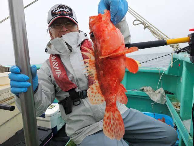 1月12日の成人の日オニカサゴ釣行してきました。実は1月4日に初釣りに出かけ70cm頭にワラサ4匹、50cmヒラメ1匹釣って全部お裾分けしました。1月11日強烈な冬型の気圧配置で爆風、12日も厳しいかなと思い11日午後7時過ぎに船長に確認の電話をしたところ“でますよ”と。志摩市御座の智栄丸午前6時半出港の8時間便でした。3名(常連さん)の乗り合い、水深110mの浅場から、前半はウネリ・白波が残っていてきつかったです。外道に終始して中盤戦へ、水深140mに移動したところ当日一番のアタリがあって電動低速で怒らせないように巻き上げ、時間をかけて慎重にやり取りして船長の差し出すタモに当日初オニ、特大オニが取り込まれました。久しぶりの大型(47cm)で早速記念撮影(写真@)。根掛かりが頻発するもののアタリも程々にあって中型オニなどを追加出来て割合忙しい時間帯でした。後半になってウネリ・波もなくなり海上は凪状態に、釣り易くなったのですが潮が流れないのかアタリが遠く暇な時間が流れて中型オニを2匹追加したのみで午後2時半の沖あがりとなりました。海上・海中の変化が激しい釣行となりました。釣果はオニ8匹(特大1匹、大1匹、中4匹、小2匹)、ウッカリカサゴ3匹、アヤメカサゴ14匹、キツネダイ1匹でした(写真A)。同船客はそれぞれオニ12匹、11匹で私はビリでした。次回も頑張ります。これからもよろしくお願いします。