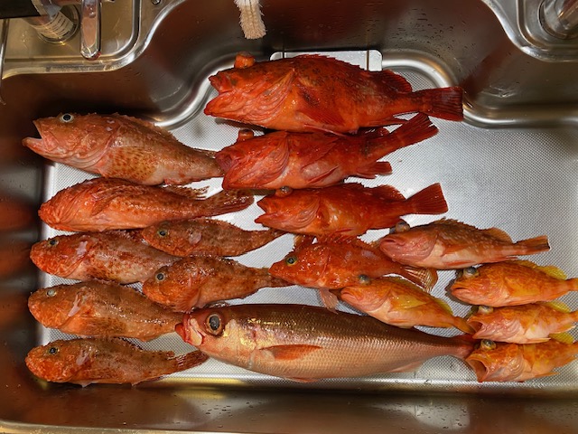 3月22日の日曜日オニカサゴ釣行してきました。いつもの志摩市御座智栄丸午前5時半出航でした。4名の乗り合いで釣座は左舷トモ(船尾側)でした。海上は凪が予想され期待が膨らみます。40分程で水深130mのポイントに到着、一投目着底と同時にまあまあのアタリがあって顔を見せたのはハチビキ(後計測40cm)でした。続けてアヤメカサゴのダブル、オニ中型・小型のダブルと好調なスタートをきりました。あとで考えると開始早々が時合だったと思われます。アタリが遠のき水深150m以深の深場へ移動、中盤は忘れた頃にアタリがある渋い状況で我慢の時間帯でした。後半になって潮変わりしたのかオニが口を使い始めやっと刺身サイズオニが来てほっとしました(写真@)。沖あがりの午後1時半まで深場を攻めたのですがパッとせず難しい釣りで終了してしまいました。船長が言うには“終始船が前方向に流れていた”と。左舷ミヨシ(船首側)の常連K氏は絶好調であがってみればオニ24匹の爆釣、先にオニがK氏の仕掛けに食らいつき、おこぼれが私に回ってくる状況だったのかも(言い訳になりますが)。それにしてもオニ3倍以上、腕の差ありますね。釣果はオニカサゴ大型1匹・中型3匹・小型3匹、ハチビキ1匹、ウッカリカサゴ4匹、アヤメカサゴ4匹、ヒオドシ1匹でした(写真A)。深場メインの釣りだったためアヤメカサゴが少なかったです。次回も頑張ります。これからもよろしくお願いします。