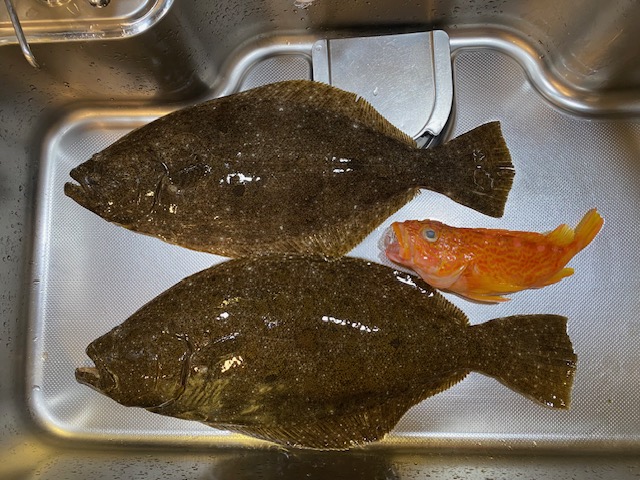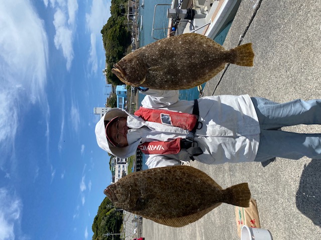 4月12日の日曜日泳がせ釣りに行ってきました。鳥羽市国崎の勝丸(2艘体制で営業)親父船でした。アジ釣りに乗船したかったのですが満席で断念、空いていた泳がせ釣りに予約しました。午前5時集合、5時半出航、6名の乗り合いでくじ引きで左舷ミヨシ(船首側)でした。北西風が中ぐらいで冬の服装(カイロなし)でも少し寒かったです。30分程沖合に走り漁礁回りで釣り開始。水深45m程度、底から1〜2m上の棚でイワシを泳がせてフィッシュイーターを狙います。長潮で潮が動いていないのかアタリがありません。船中ヒラメがたまにあがりますが私の竿先はピクリともしません。午前9時前が干潮の潮止まりで前半・中盤はアタリ0、厳しい状況でした。最近貧果が続く負のスパイラルにはまっていますがさらに延長するのかと。後半になって潮が動いてきたのか小さなアタリで良型アヤメカサゴゲット。沖あがり30分前に国崎港近くの浅場(水深30m台)にポイント移動。ヒラメらしき初アタリがあって合わせも決まって良型ヒラメゲット、何とか坊主は免れました。一安心して即投入、ウソみたいですがすぐにアタリがあって2匹目の良型ヒラメゲット。最後の最後にクライマックスが待っていました。午前11時半沖あがり、何とか帳尻があって良かったです。釣果は56cm、53cmのヒラメ2匹、アヤメカサゴ1匹でした(写真@、写真A)。次回も頑張ります。これからもよろしくお願いします。